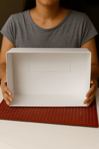 Dessine la visière à l’intérieur afin de pouvoir la découper ensuite en toute sécurité, le fond contre la planche à découper…